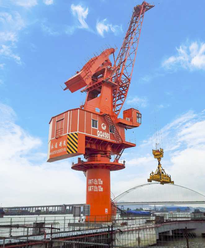 GQ4535固定式港口起重機(jī)用于港口、中小型碼頭,亦可用于庫場,堆?;驈S區(qū)內(nèi),進(jìn)行件雜貨或散貨裝卸作業(yè)。固定式吊機(jī)為單臂架式,鋼絲繩變幅,采用復(fù)滑輪補(bǔ)償,貨物可作水平位移,因此可全幅度帶載變幅,作業(yè)效率高。旋轉(zhuǎn)支承采用單排滾珠座圈,可作360。全旋轉(zhuǎn),運(yùn)轉(zhuǎn)平穩(wěn),使用可靠。
