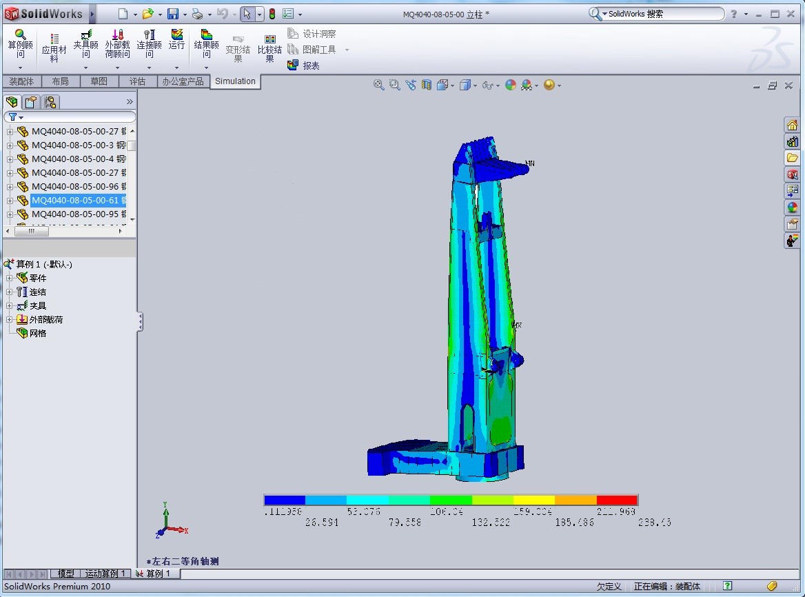 AutoCAD、SolidWarks等先進(jìn)軟件進(jìn)行設(shè)計(jì),對(duì)主要受力構(gòu)件和零部件都采用有限元分析軟件Simulaticn進(jìn)行有限元分析和優(yōu)化設(shè)計(jì),大大縮短